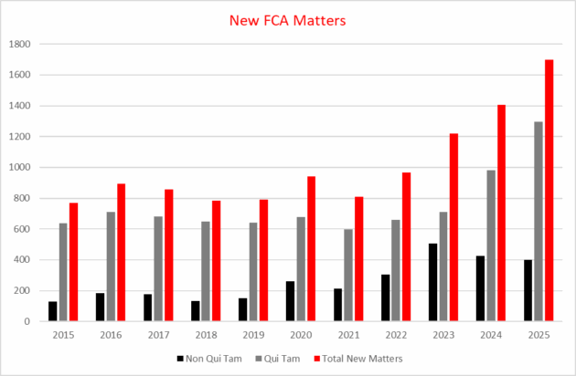 The overall number of new matters that the government and relator proxies opened in FY 2025 reached an all-time high of 1,698, topping FY 2024’s record of 1,405 new matters by approximately 21% (with the FY 2024 record itself topping the previous record from FY 2023 by 15%). Whistleblowers filed a record 1,297 of these lawsuits — the highest number in a fiscal year since the DOJ began keeping records in 1987 and a 32% increase over the FY 2024 high (980 matters brought by whistleblowers). The DOJ opened the remaining 401 new matters, representing a modest decrease from FY 2023 (506) and FY 2024 (425) in matters the DOJ brought without whistleblowers.